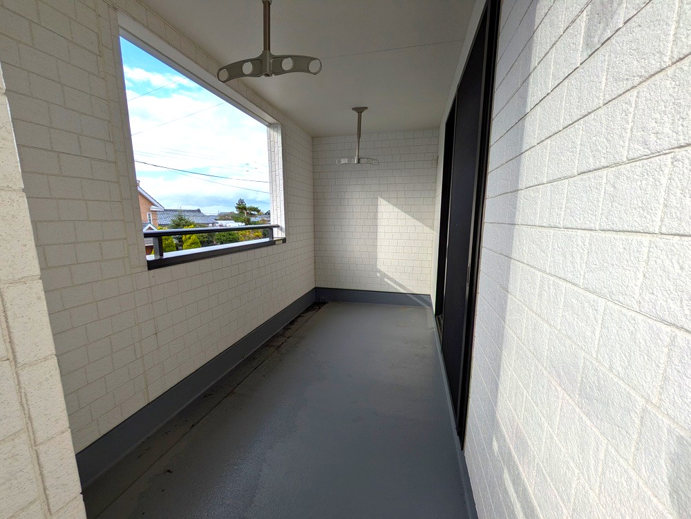 屋根付きの2階バルコニー。日差しや雨を気にせず洗濯物を干せる、快適で使い勝手の良い空間です。