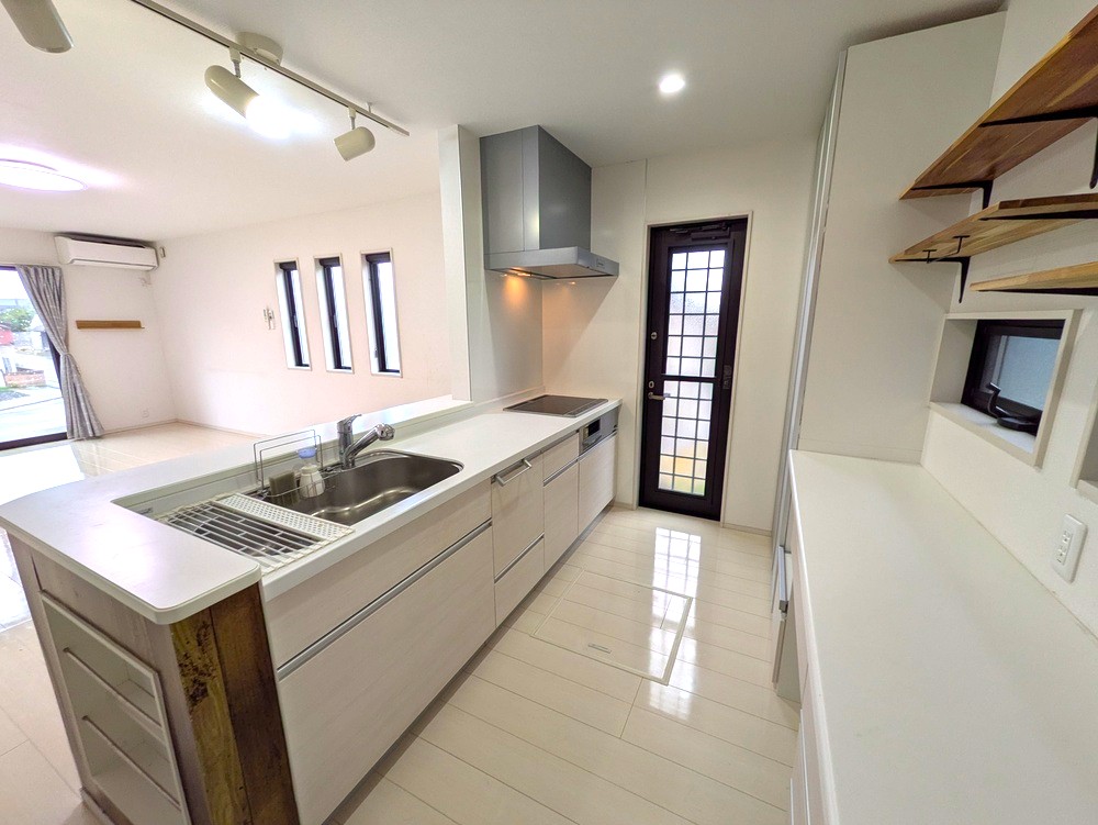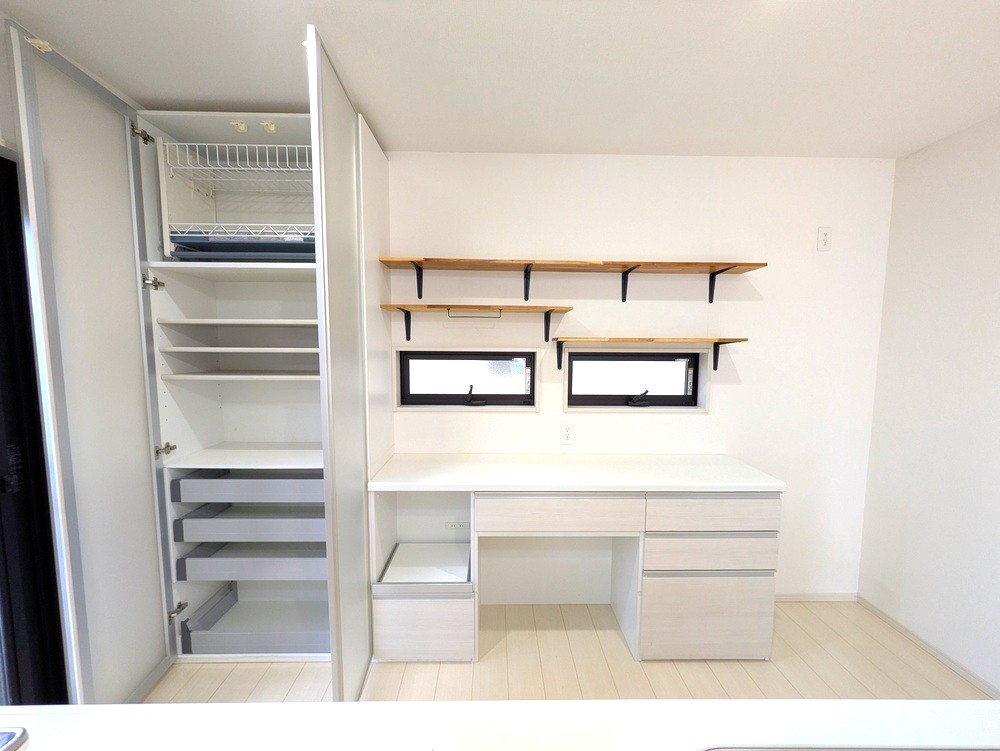 キッチン背面には備え付けの収納スペースを完備。調理器具や食器をすっきり整理でき、使いやすさと美しさを両立しています。