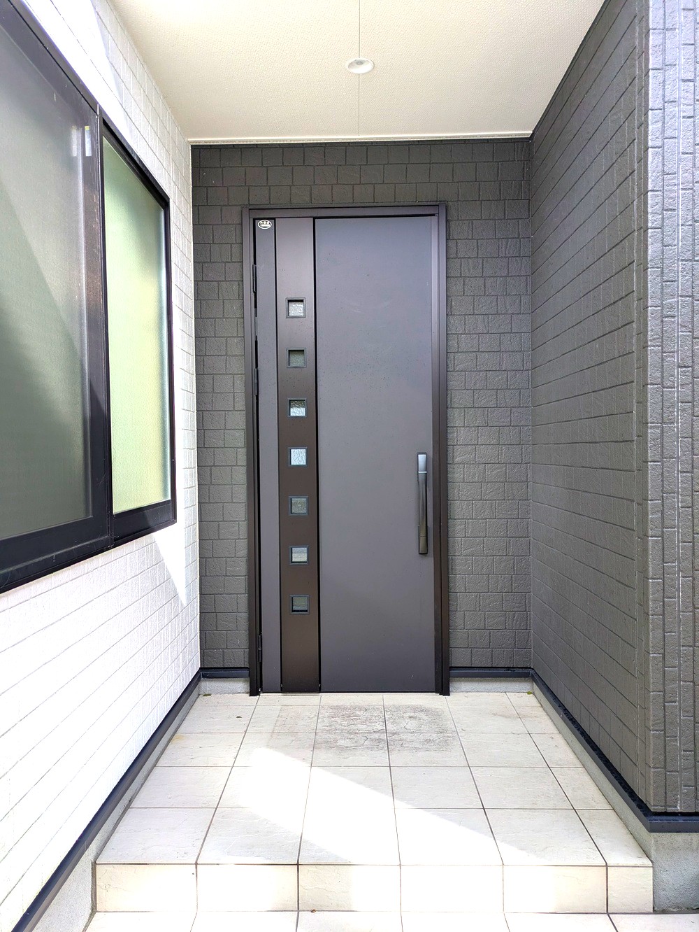 外観と調和した玄関。白を基調とした建物に、優しい印象を添える入り口空間です。