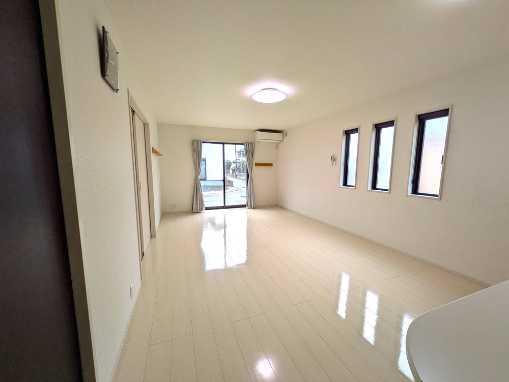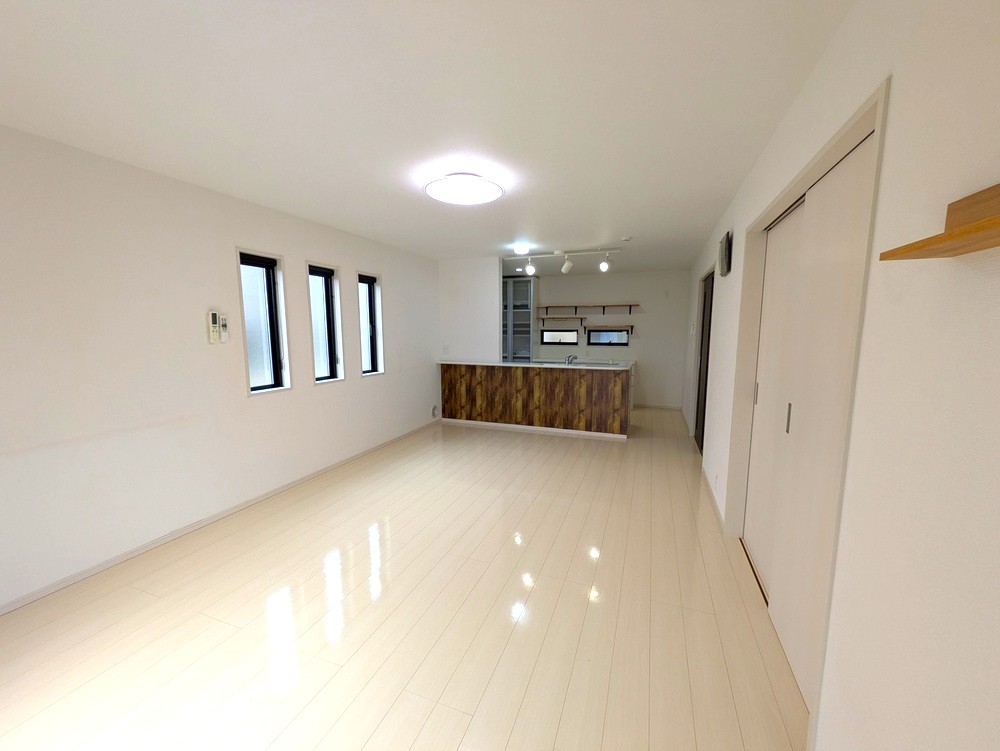 広々18帖のLDKは白いフローリングでさらに明るく開放的。家族の会話が自然に弾む、くつろぎのリビング空間です。