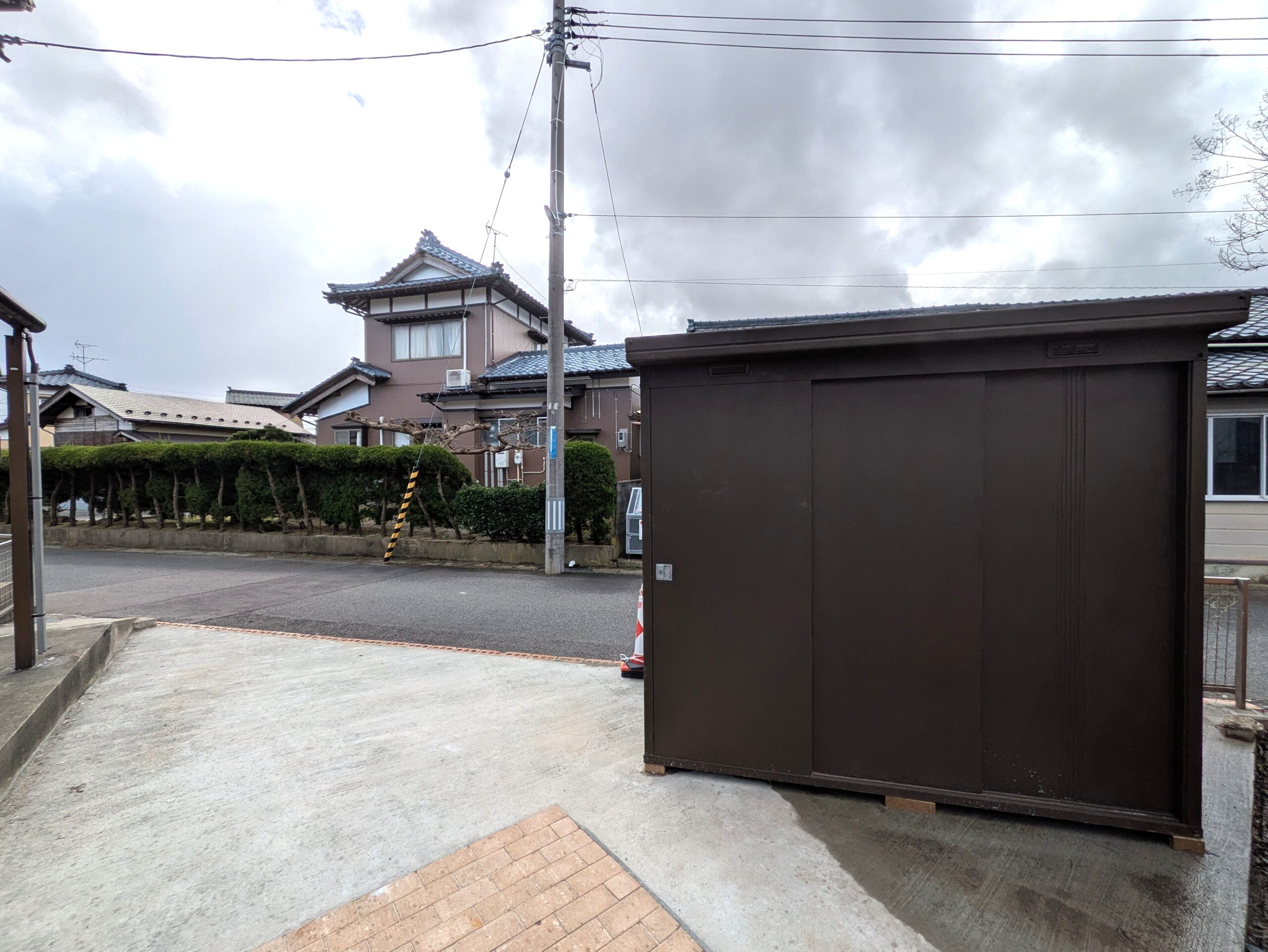 外側には外部物置があります。 タイヤの保管等に利用できるので便利ですね。