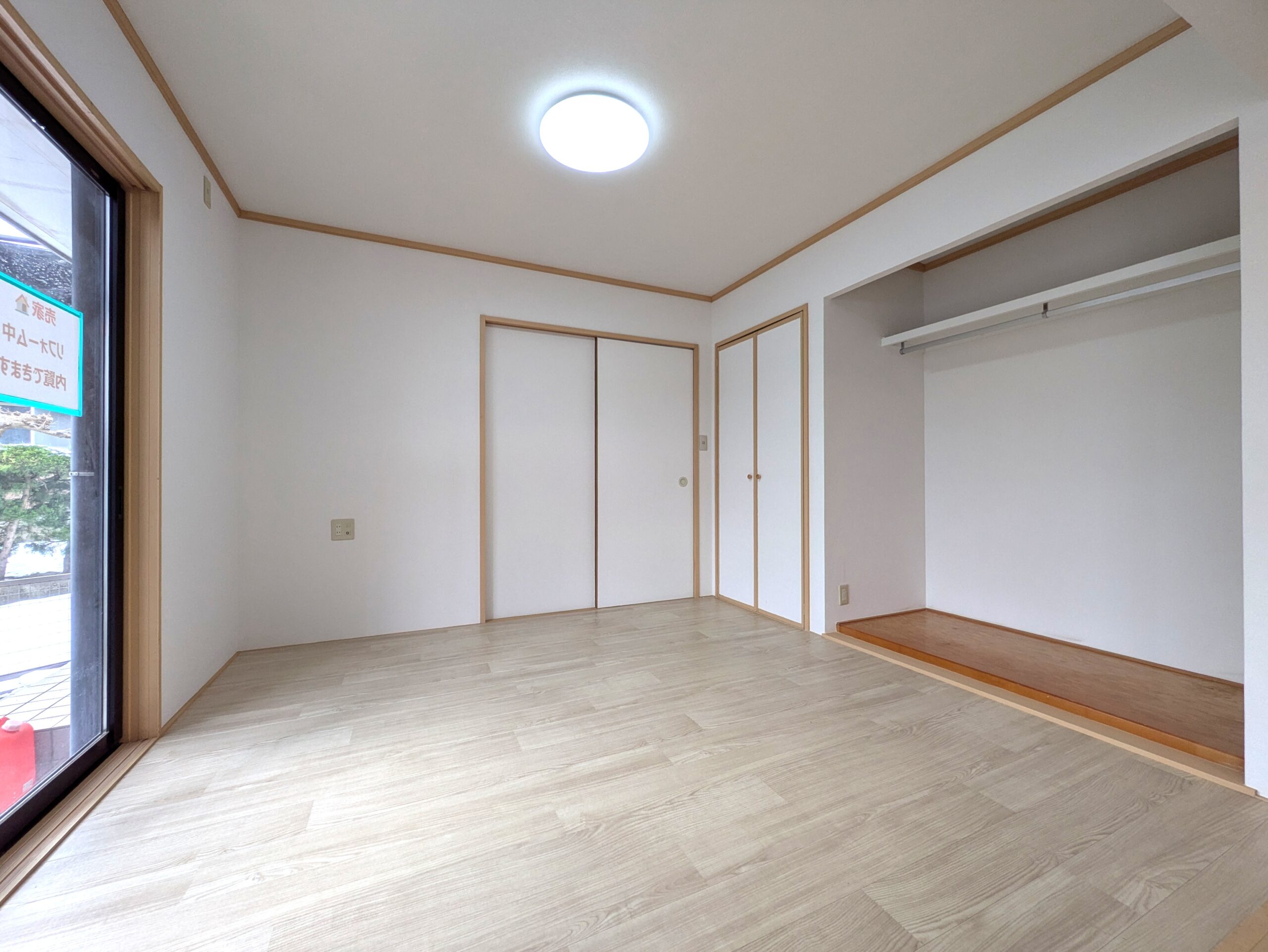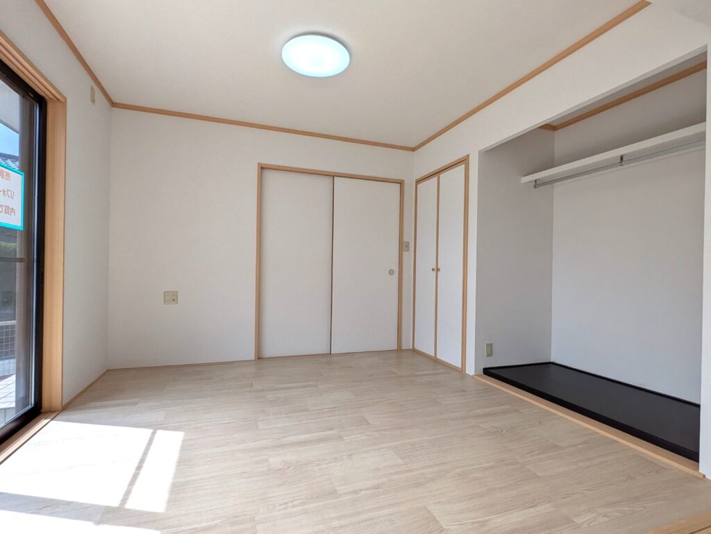 2階8帖洋室写真。 天井壁のクロスと床材を張り替えました。 通常のクローゼットに加え、ウォークインクローゼットが付属しています。