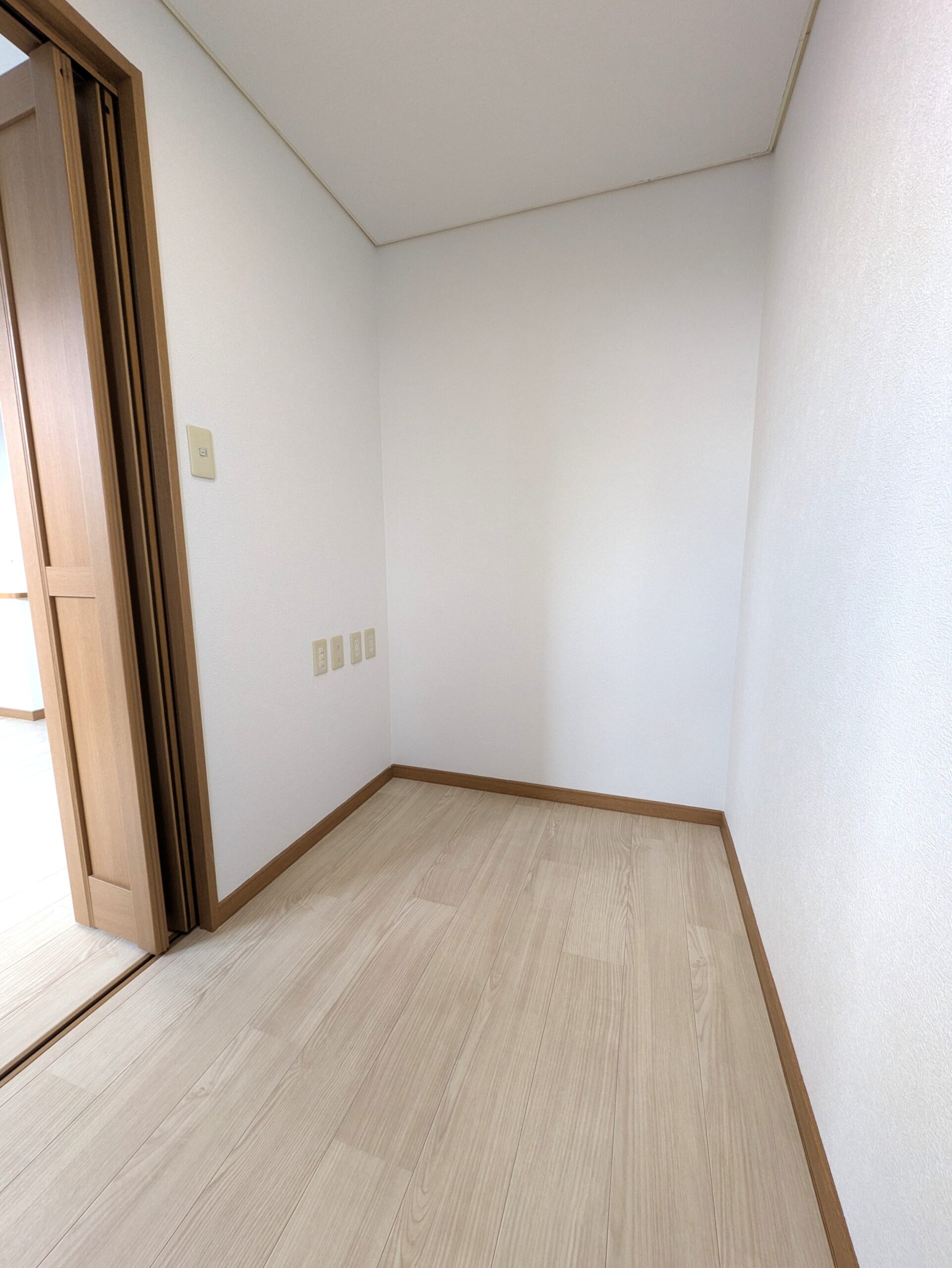 ウォークインクローゼット写真。 天井壁クロスと床材を張り替えました。 コンセントが豊富にあるので書斎としてもご利用いただけます。 荷物も収納できますし、ちょっとした書斎としても利用できます。