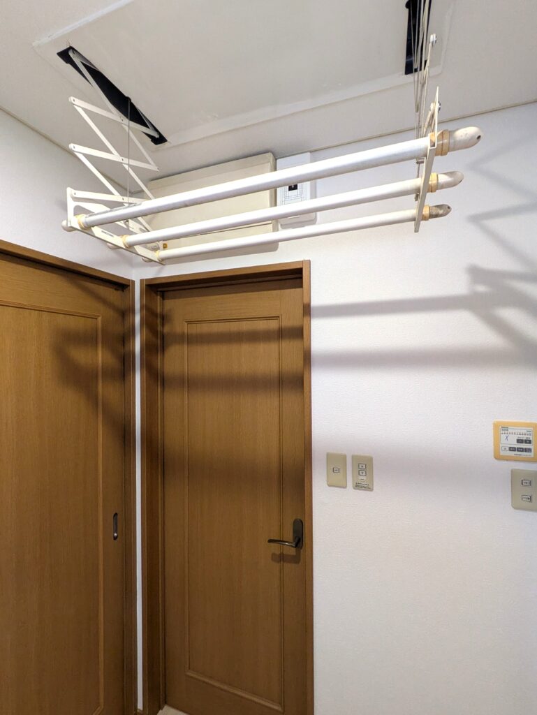 洗面脱衣所には電動昇降式の物干しがあります。 使わないときは収納できますし、ボタン一つでで上げ下げできるのはとても便利ですね。