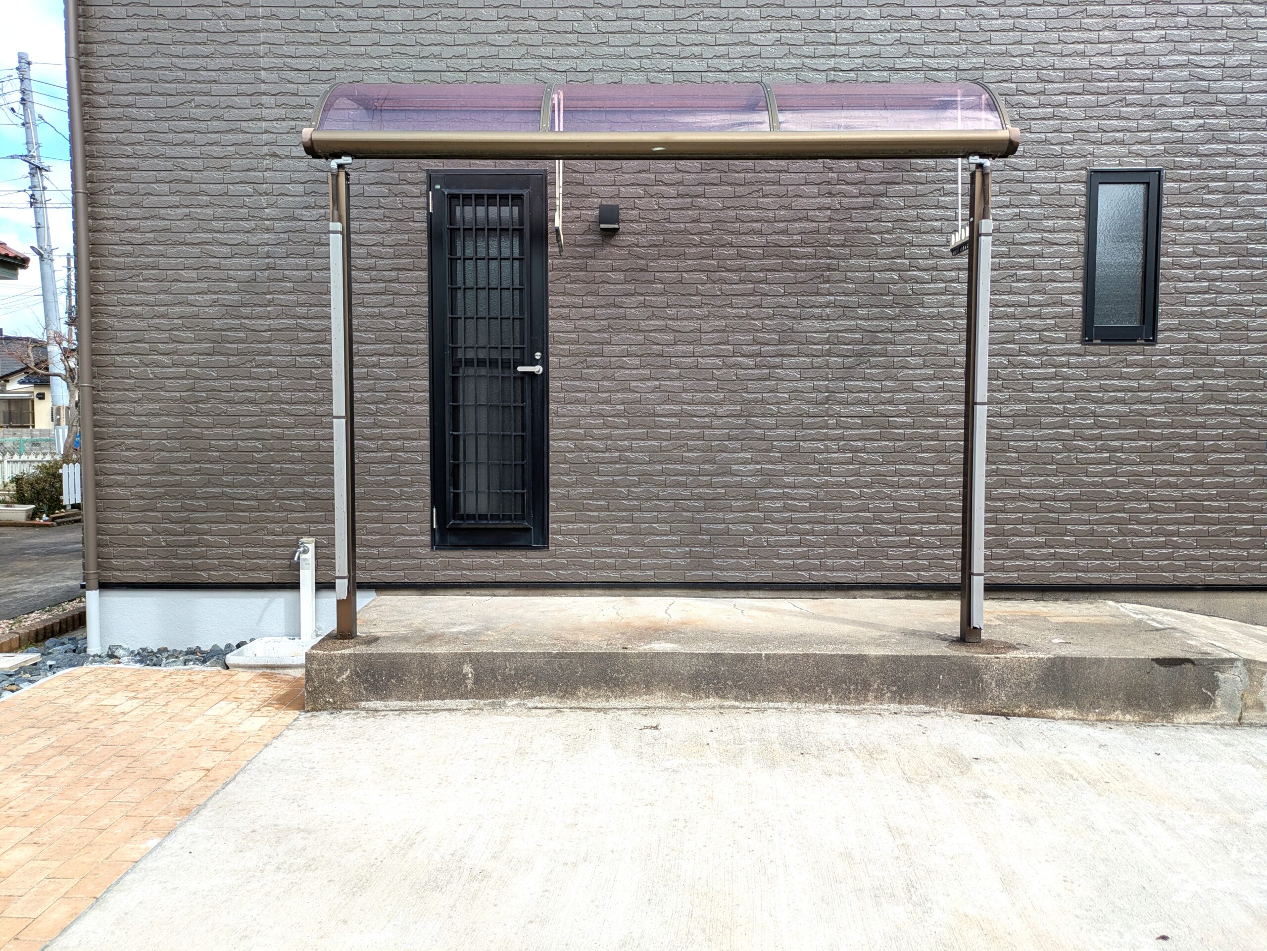 勝手口を出ると雨防止の屋根があります。 物干し設備も付属しているので、お洗濯にも便利ですね。