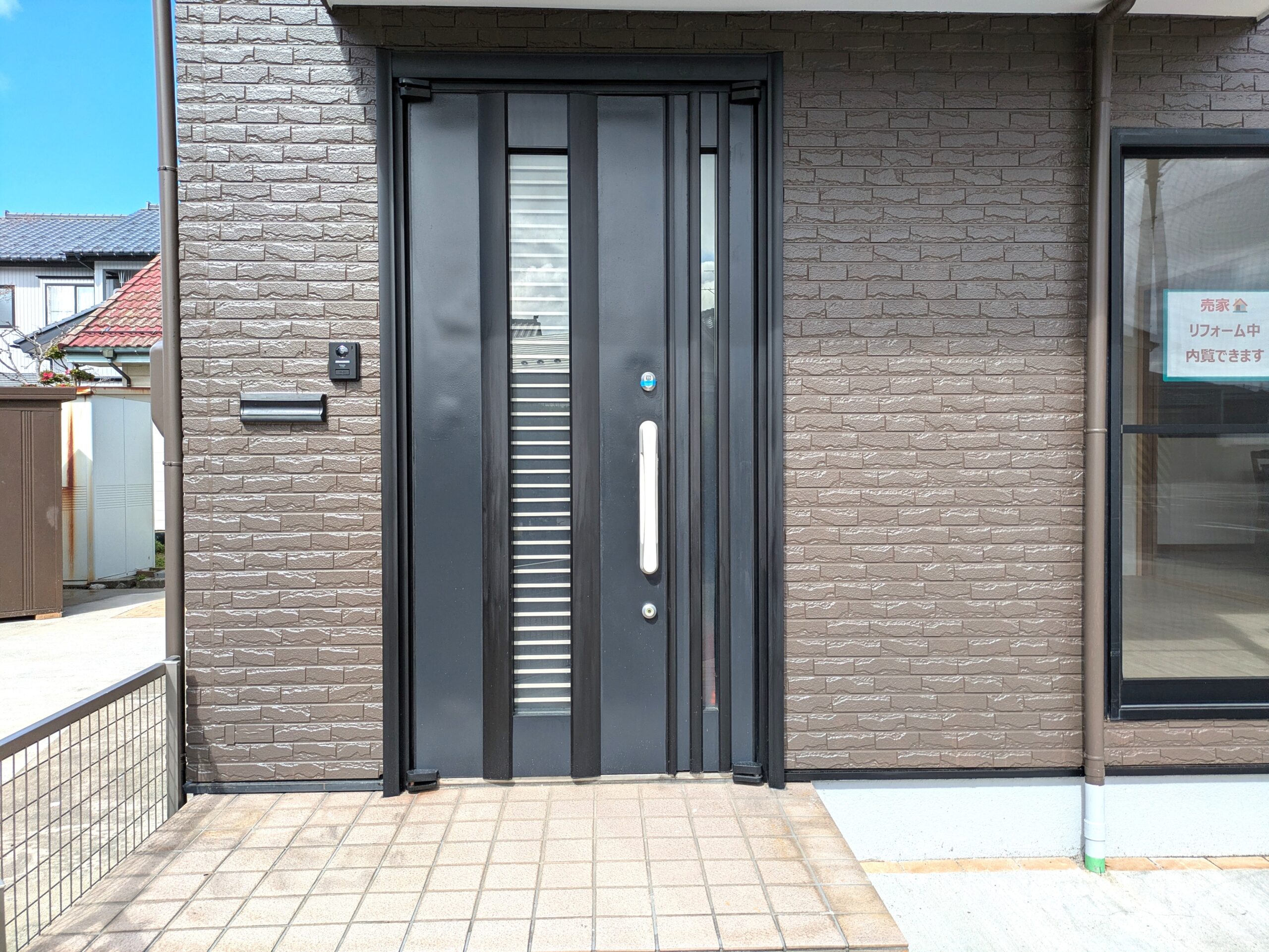 玄関写真。 外壁同様、玄関扉にも塗装を行いました。 ピカピカの玄関は気持ちよくお出かけできますね。