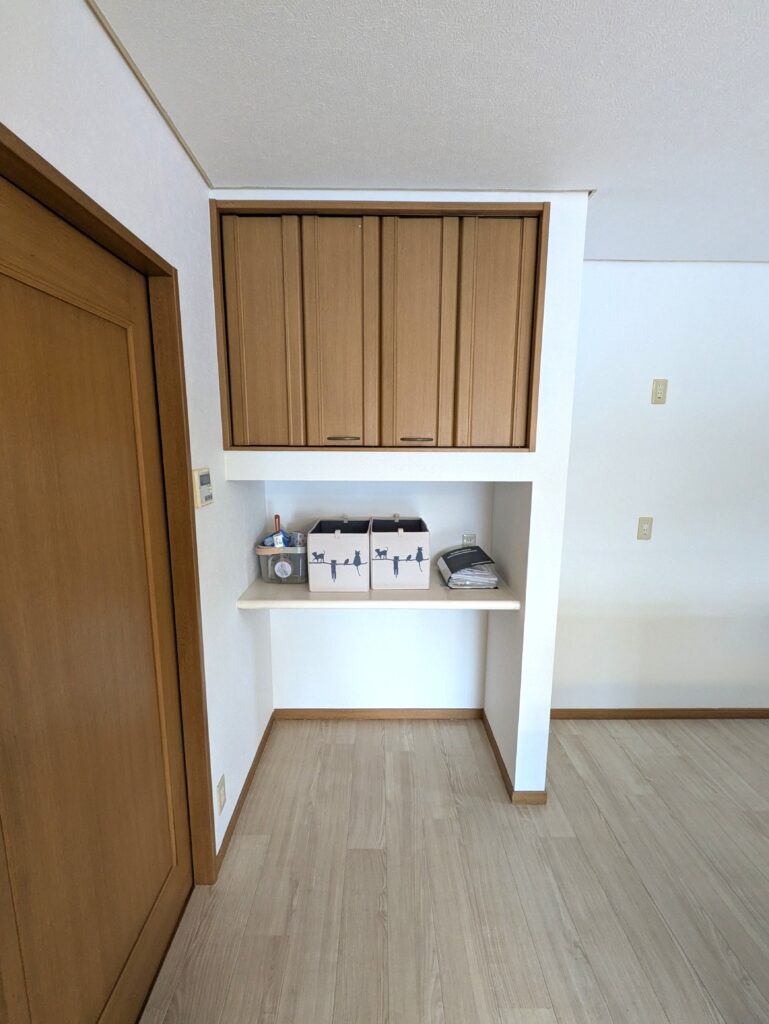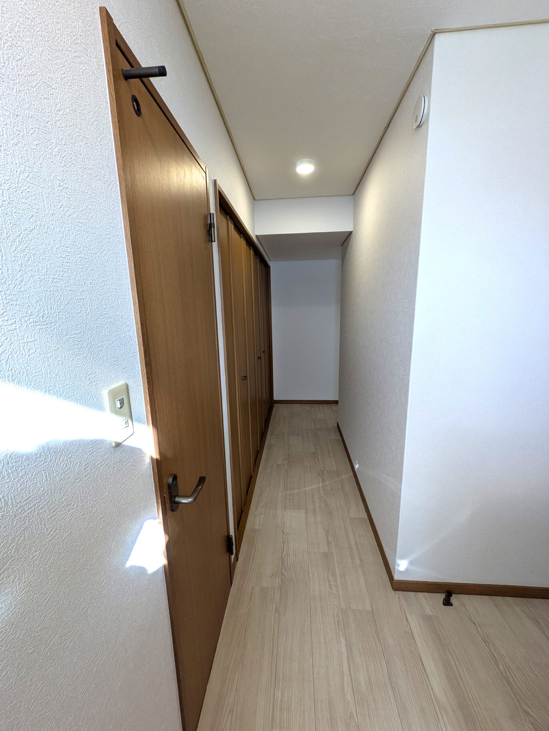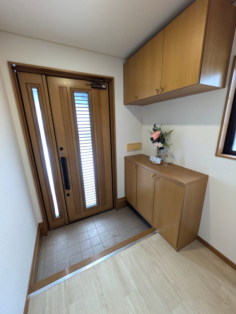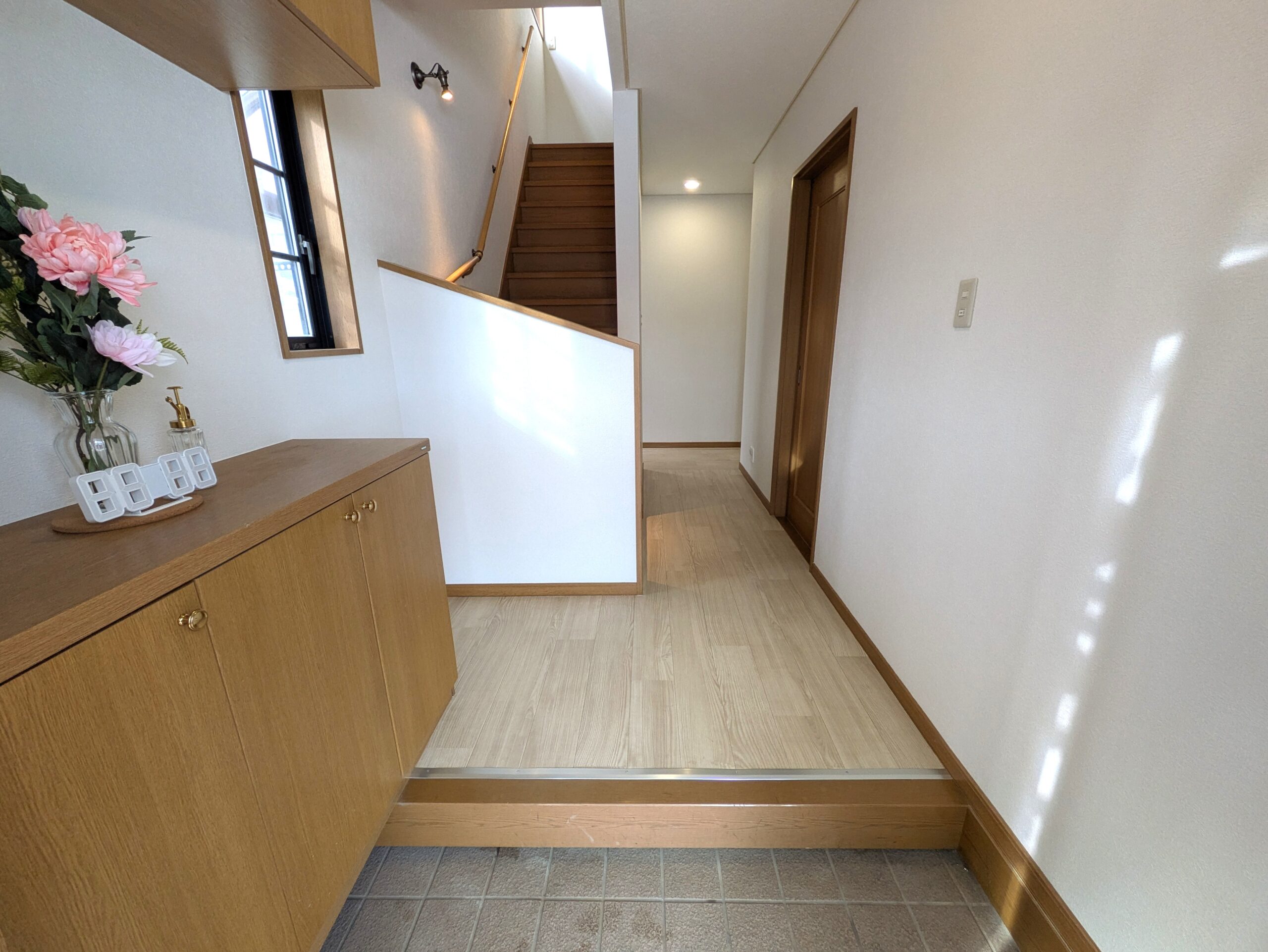廊下側から見た玄関写真です。 シューズボックスは上段にもあるので、季節に応じて入れ替えるのも良いですね。