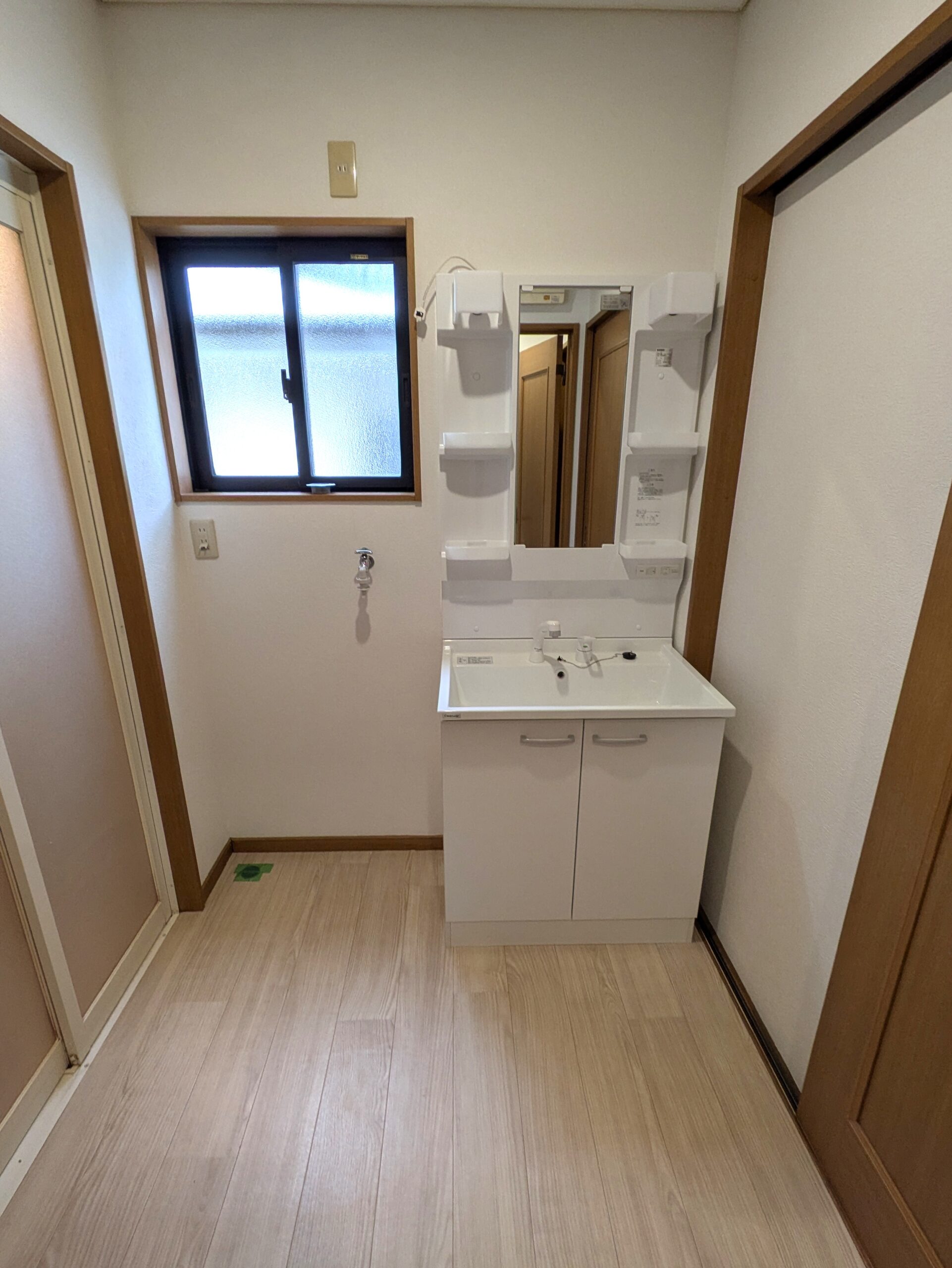 脱衣所写真。 洗面化粧台は新品と交換しました。 廊下やLDKとも繋がっている、導線の良い脱衣所です。