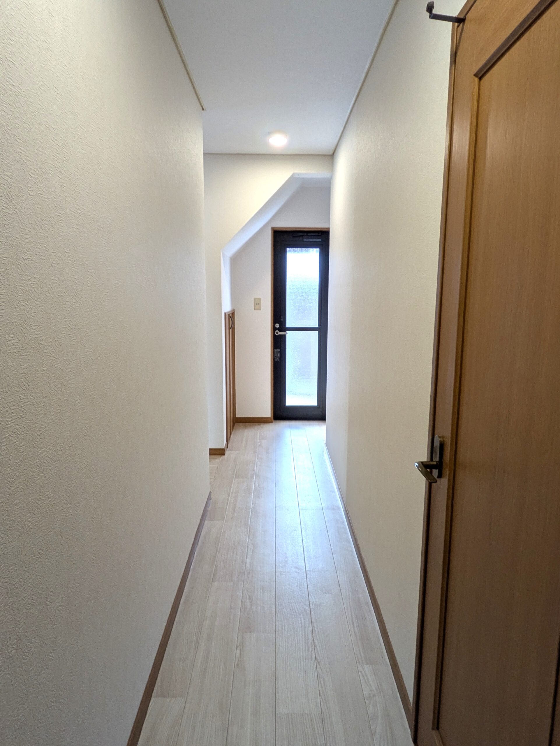 1階廊下写真。奥側には勝手口があります。 勝手口を出ると外部収納があるので導線的にも便利です。