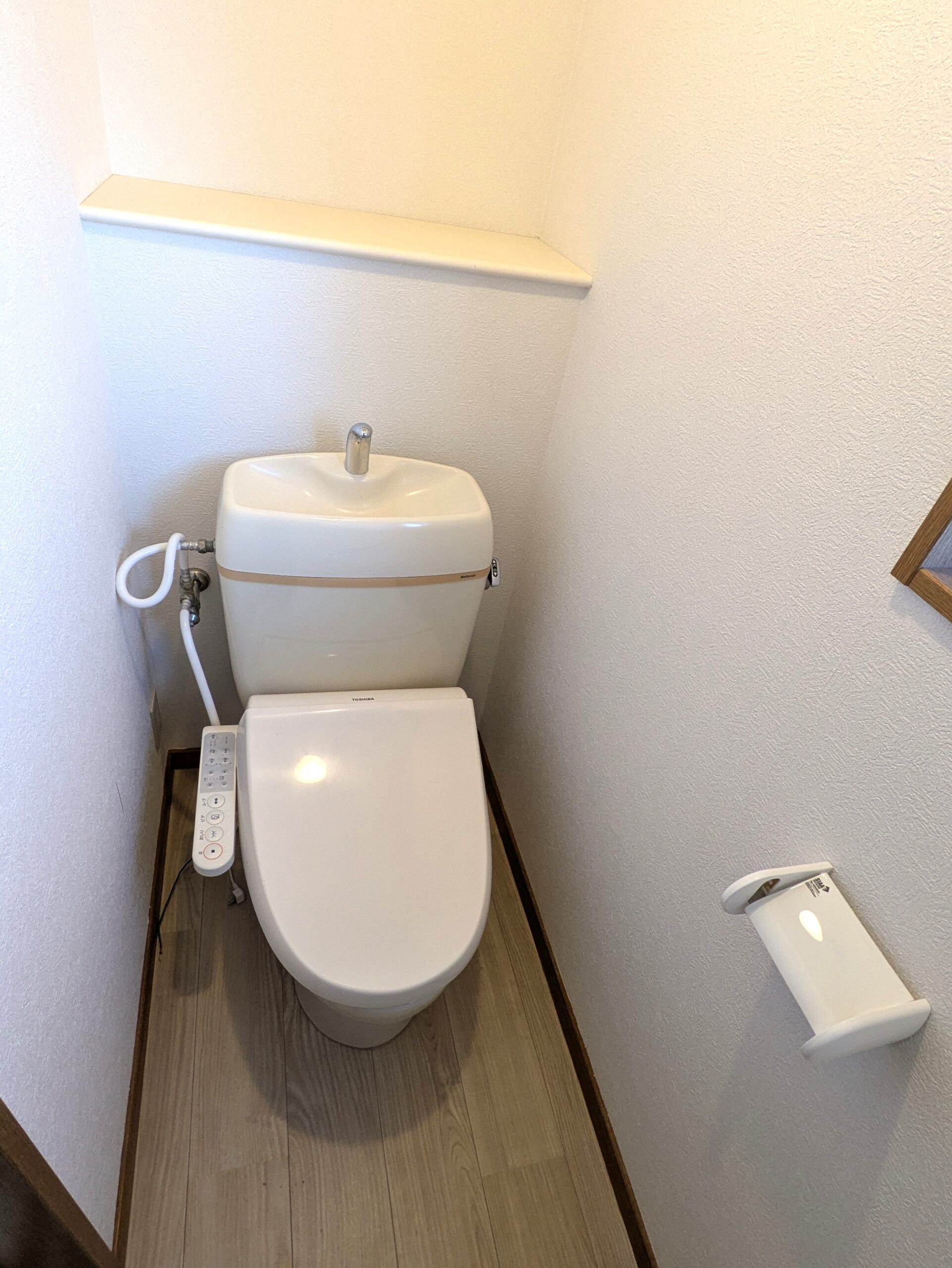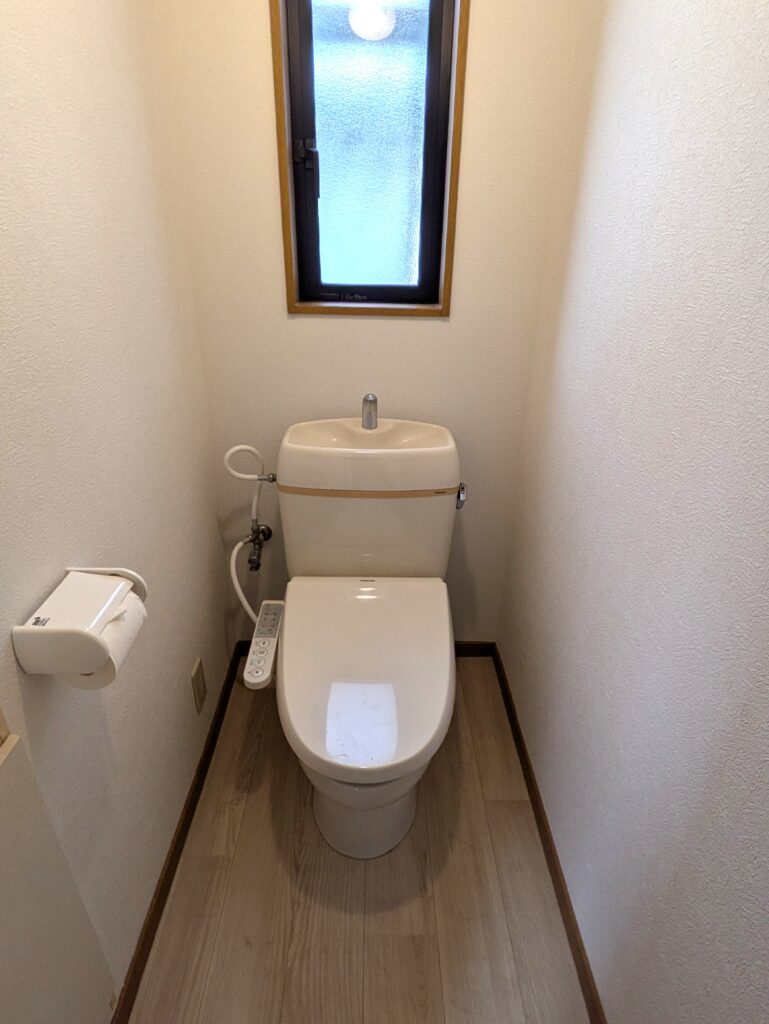 2階トイレ写真。 1階トイレ同様、天井壁はクロスを張り替え、床はクッションフロアを新品に交換しました。 各階にトイレがあるので便利ですね。
