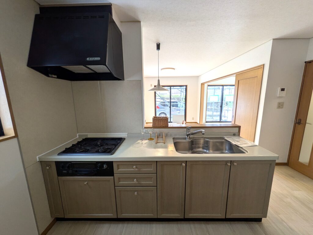 キッチン写真。便利な対面キッチンでリビングの様子を見ながら家事が出来ます。 これから新品照明を設置した後、ハウスクリーニングをしてお引渡しします。