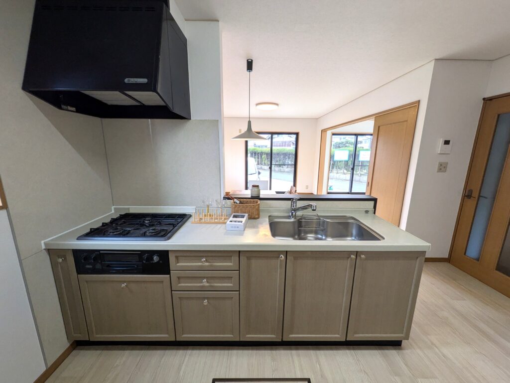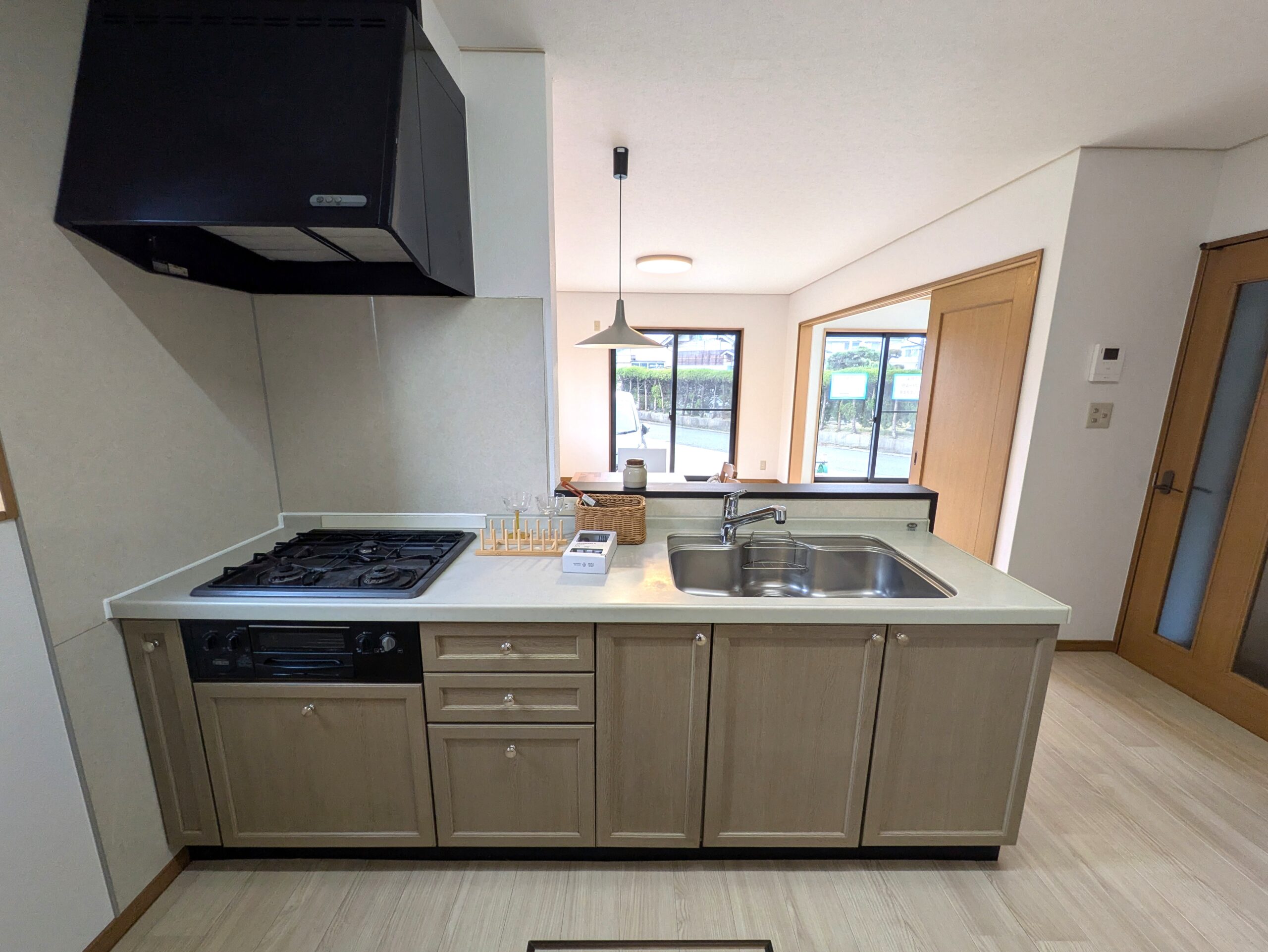 キッチン写真。便利な対面キッチンでリビングの様子を見ながら家事が出来ます。 新品照明を設置したので、明るい手元で安心してお料理が出来ますね。