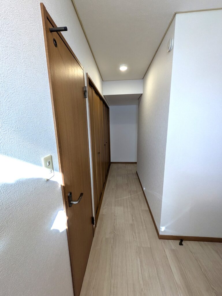 2階廊下写真。 天井壁のクロスと床材を張り替えました。 廊下にはクローゼットがあるので家族共有の収納スペースとして使用できます。