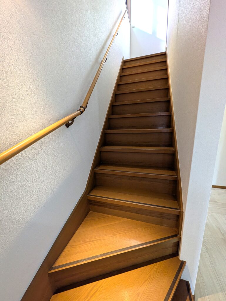 階段写真。 天井壁クロスを交換し、照明交換をしました。 手すりが付いているのも安心できるポイントですね。
