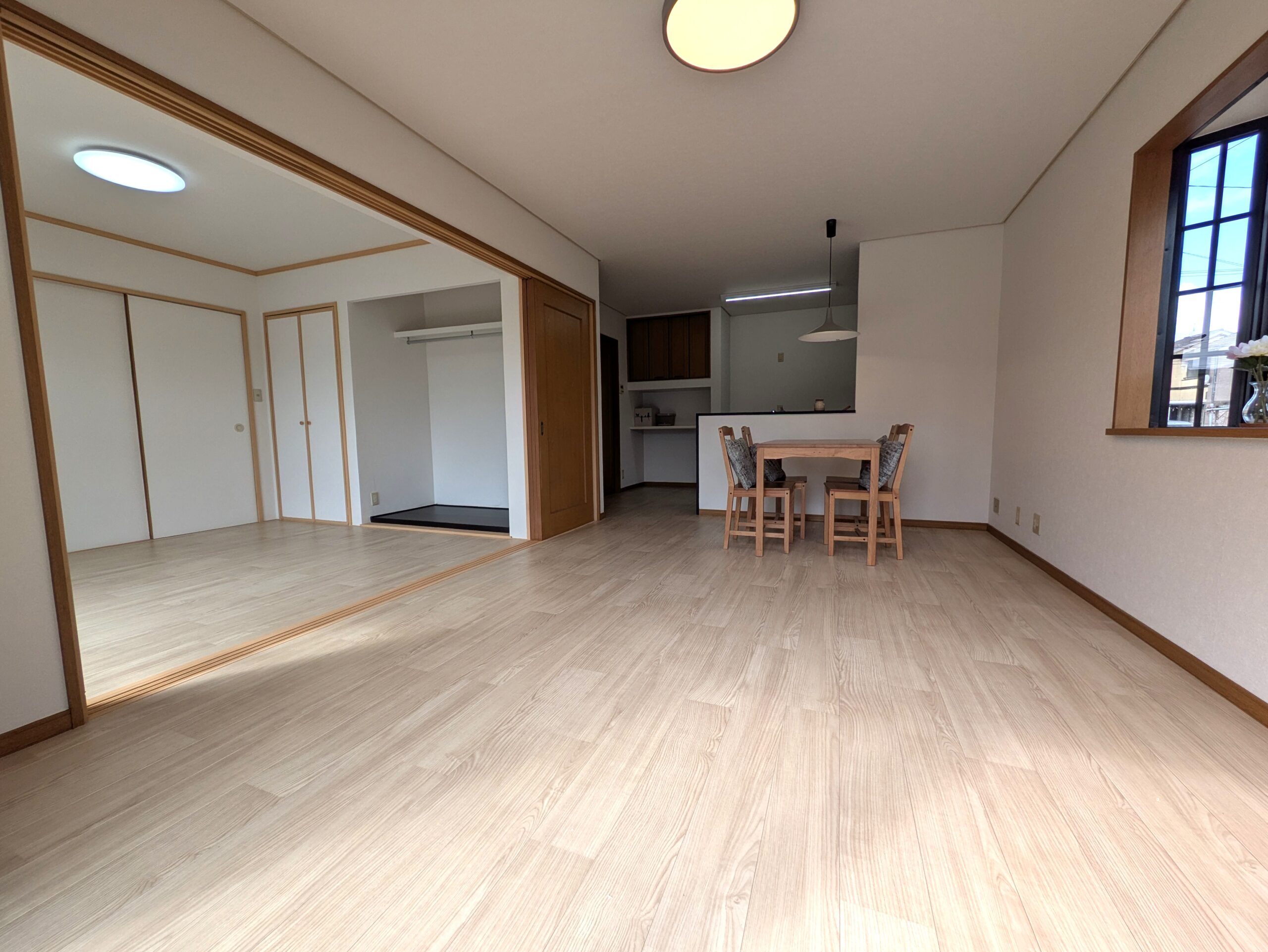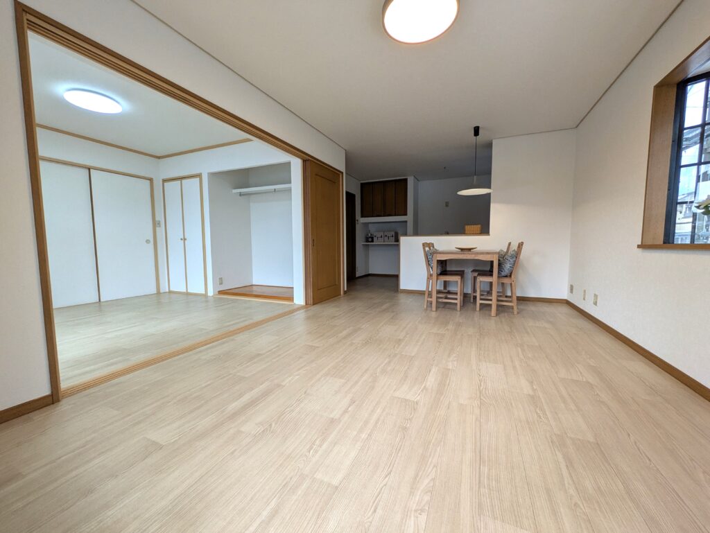 約15.5帖のLDKです。家族がゆったりと過ごせます。隣接する5.8帖の洋室と合わせれば、さらに広々したスペースで家族が過ごせますね。