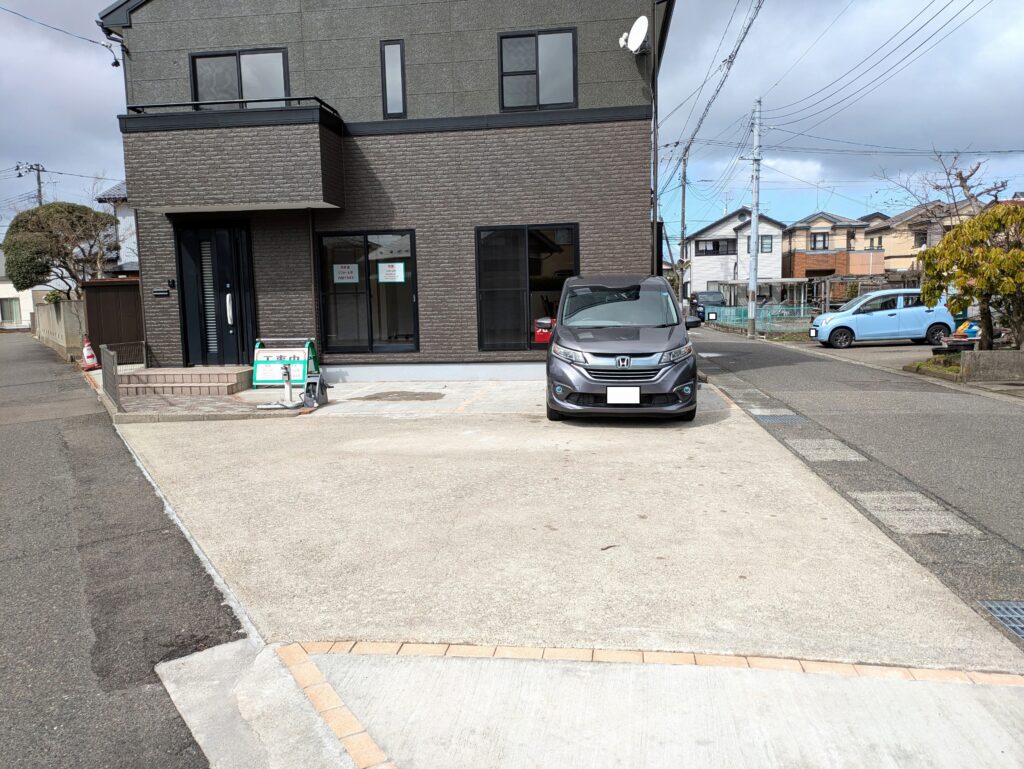 駐車場写真。 建物前面に3台、建物側面に1台駐車できます。 最大で4台駐車可能です。