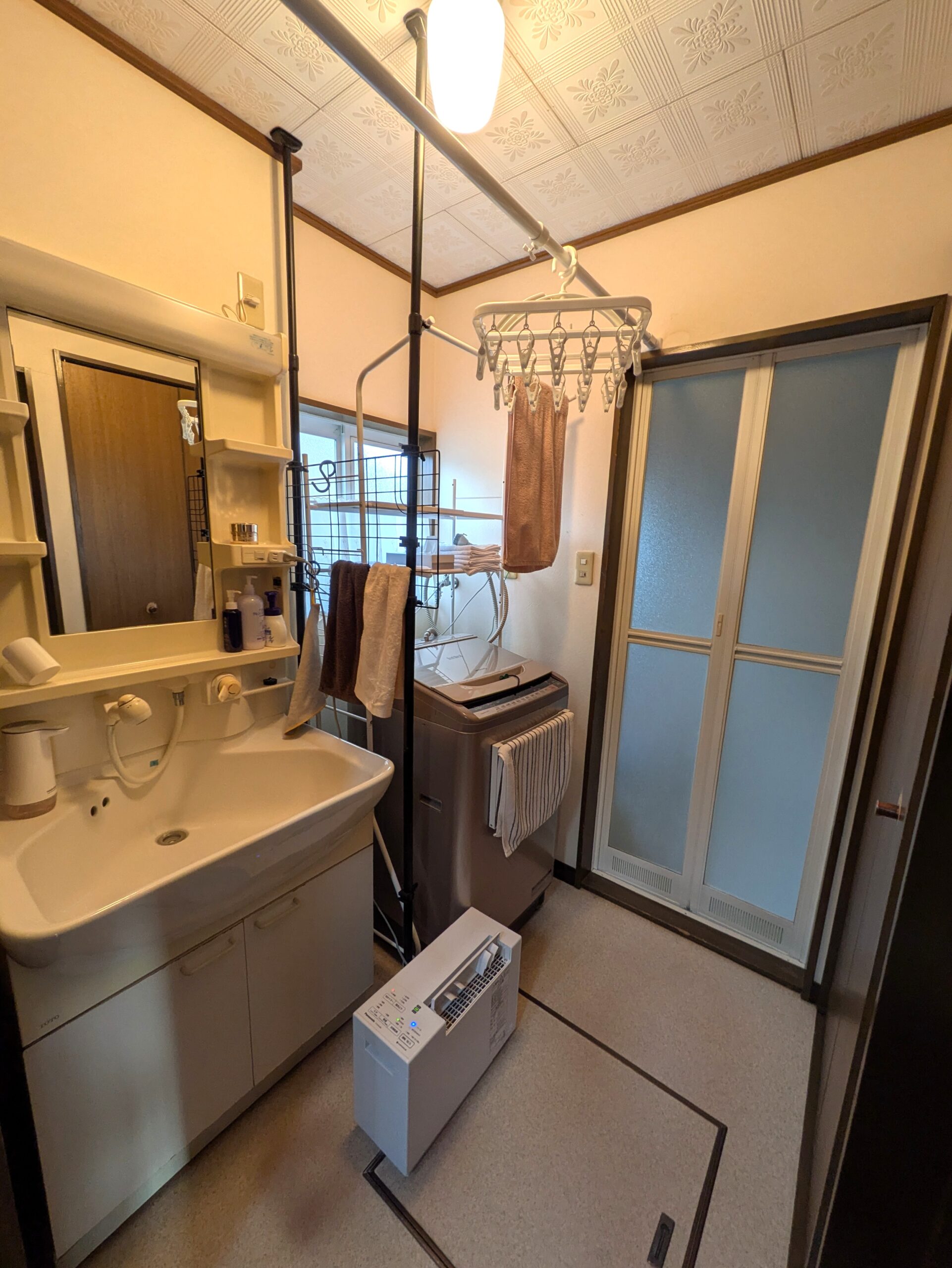 洗面台脱衣所写真。 洗面台はシャワーノズル付き。 廊下とLDKのどちらとも行き来が出来るので導線が良いですね。