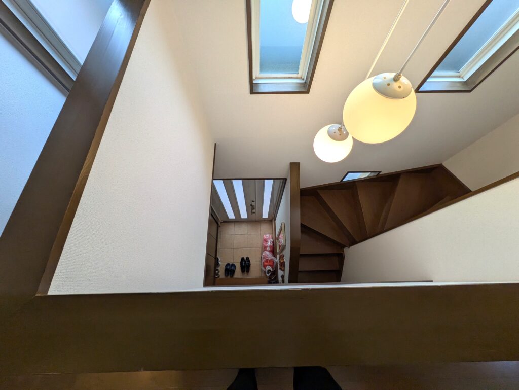 吹き抜け写真。 玄関上には吹き抜けがあります。 開放感のある玄関は毎日気持ちよく出入りが出来ますね。