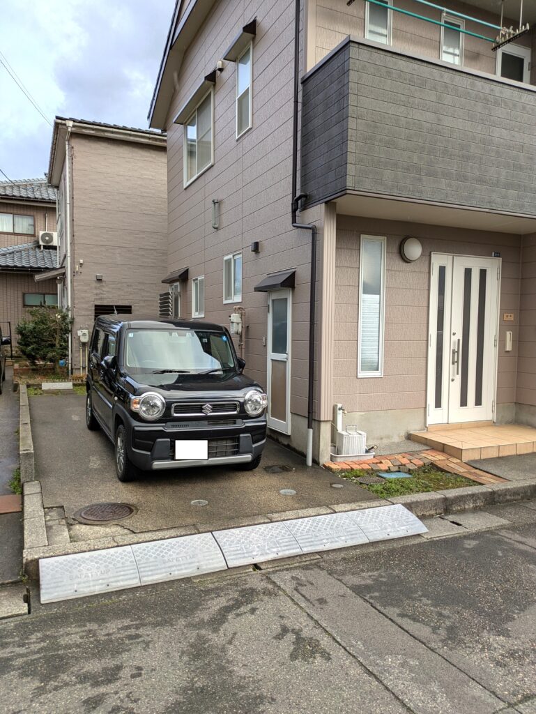 駐車場写真。幅約3m、奥行き約9mです。 最大で二台駐車可能です。 車の所有台数が多い方には、目の前に月極駐車場があります。