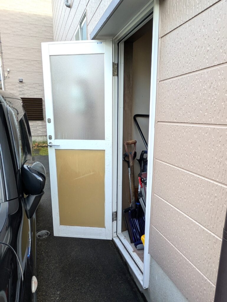 駐車場横には外部収納があります。 タイヤや除雪道具の収納など、様々な用途にご使用頂けます