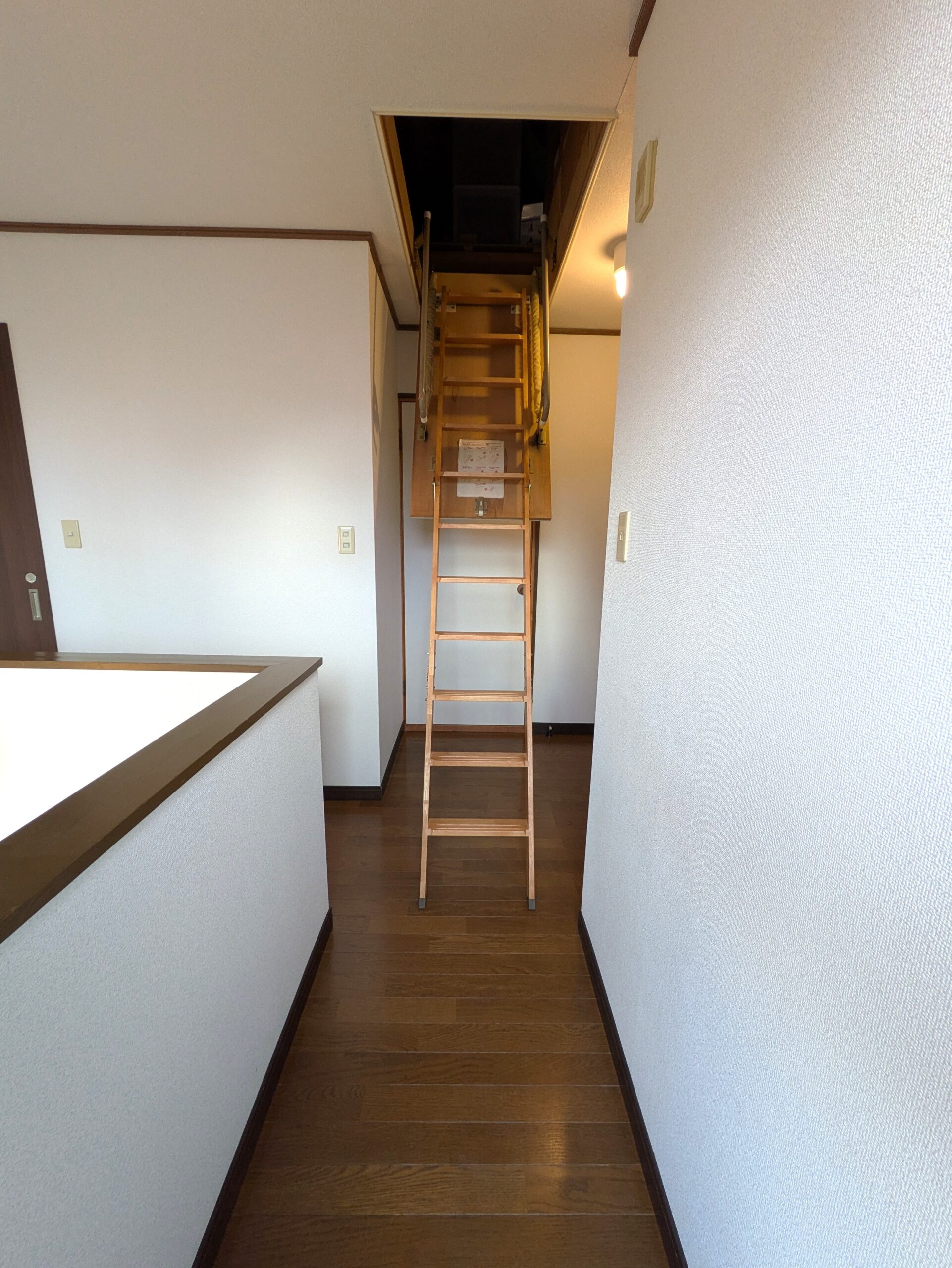 小屋裏収納写真。 2階廊下からは天井側へと続く、小屋裏収納があります。 季節毎に収納を入れ替えできるので便利です。